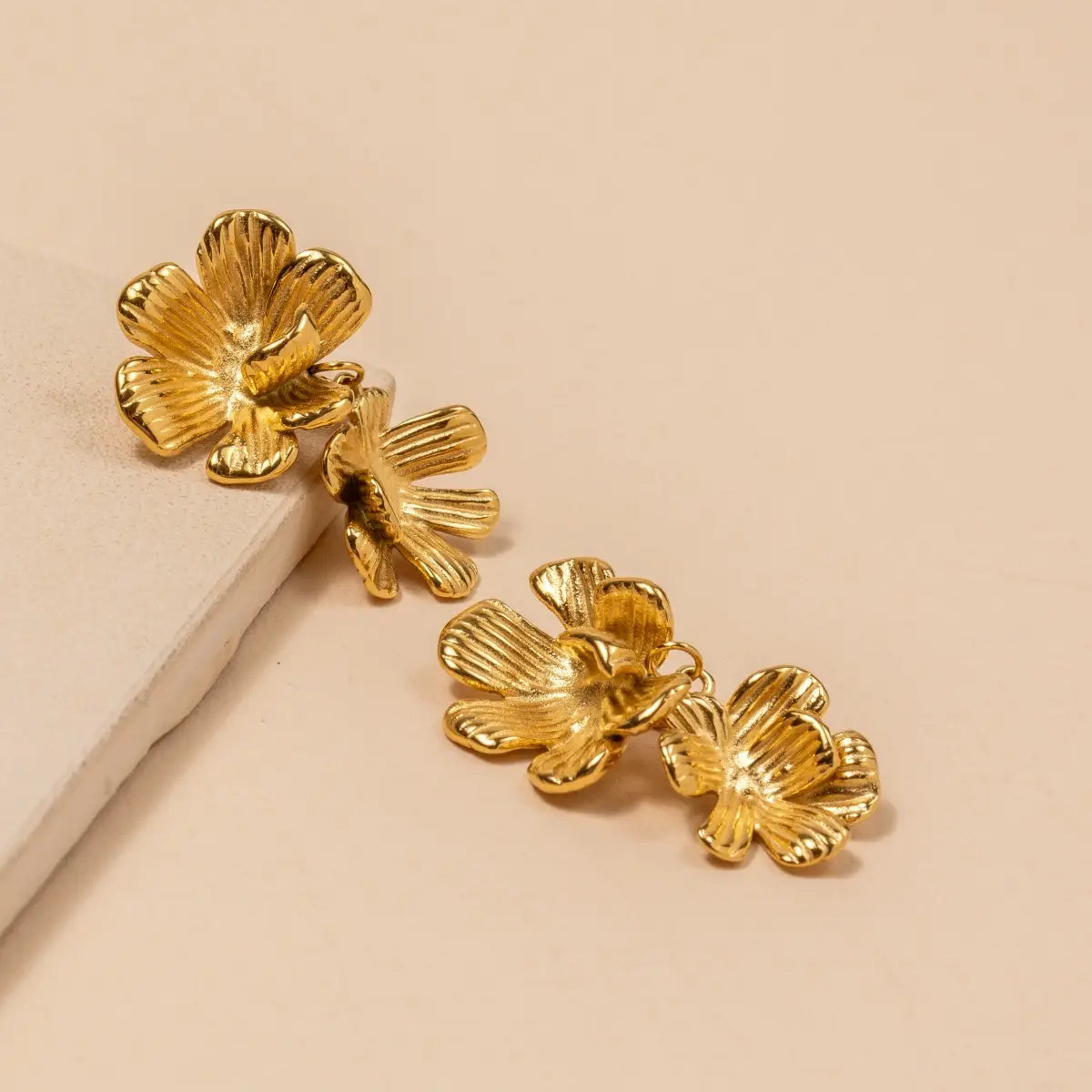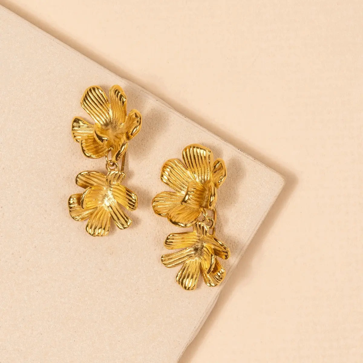 Add a touch of elegance to your outfit with our Double Flower Gold Earrings. Made with high-quality materials, this 18K gold plated stainless steel earring is not only stylish but also water-resistant for long-lasting durability. Trust in its guaranteed quality and intricate design for everyday wear.