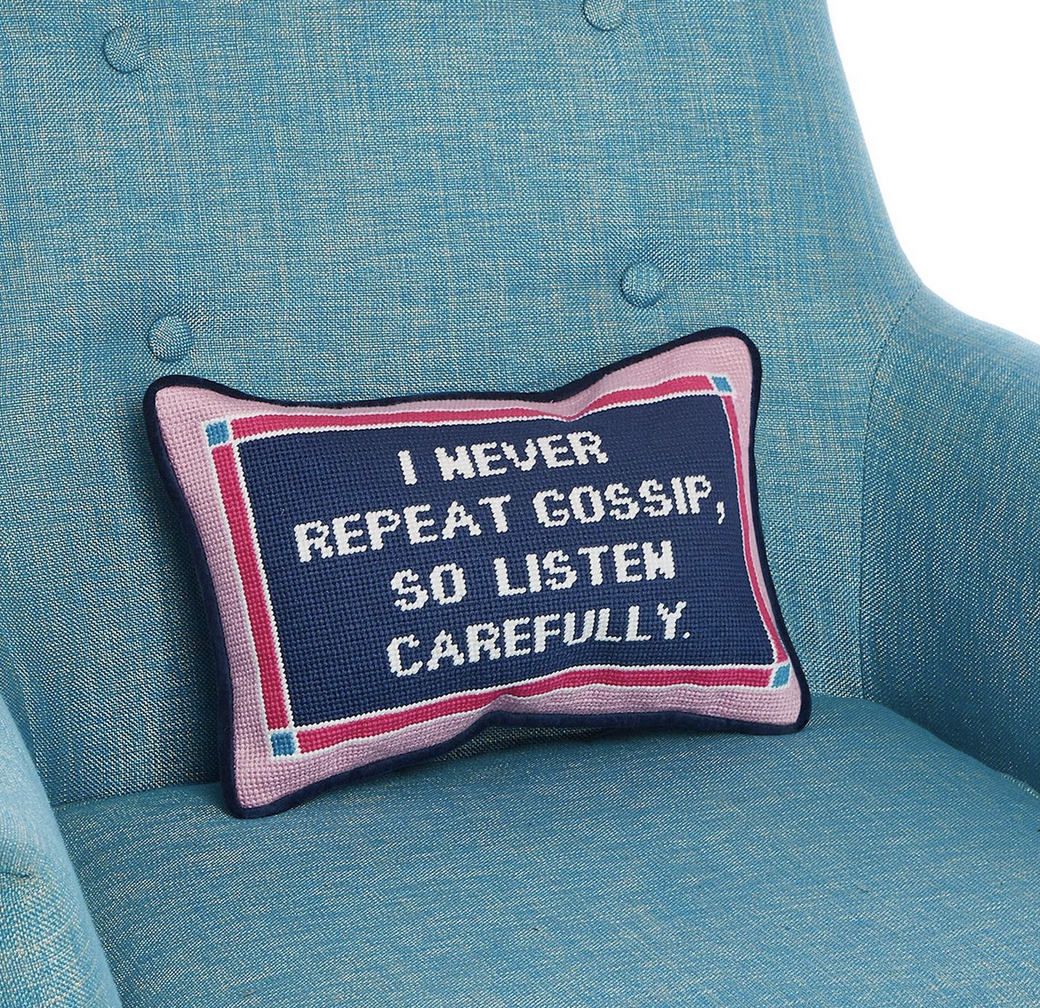 Bring a cheeky conversation starter to your space with this witty needlepoint pillow. Featuring the playful "I Never Repeat Gossip" message in classic needlepoint detail, it's trimmed with soft velvet piping for a polished look. The 8" x 12" size fits perfectly on sofas, chairs, or beds, while the plush PP filling ensures cozy comfort. Cotton/polyester blend cover with flap closure. Spot clean only.