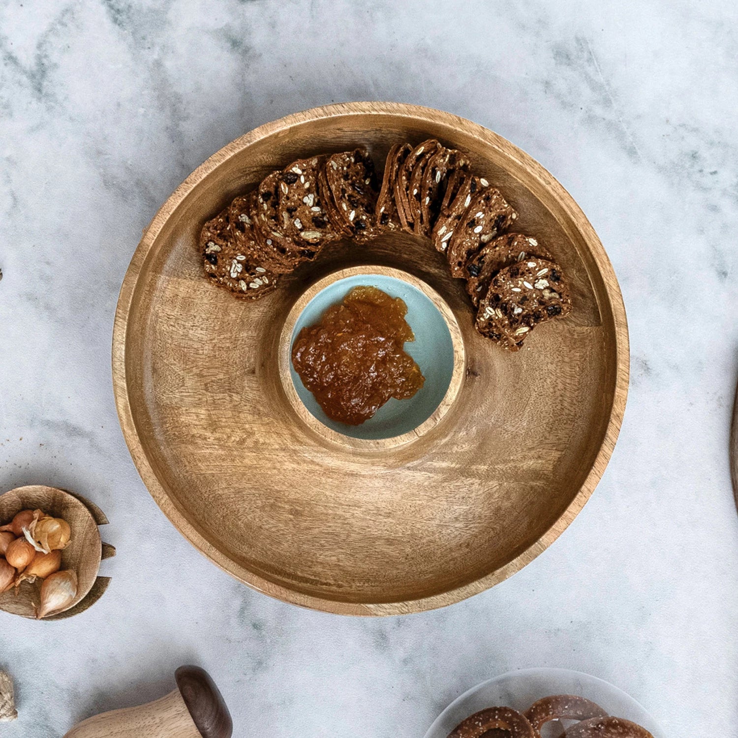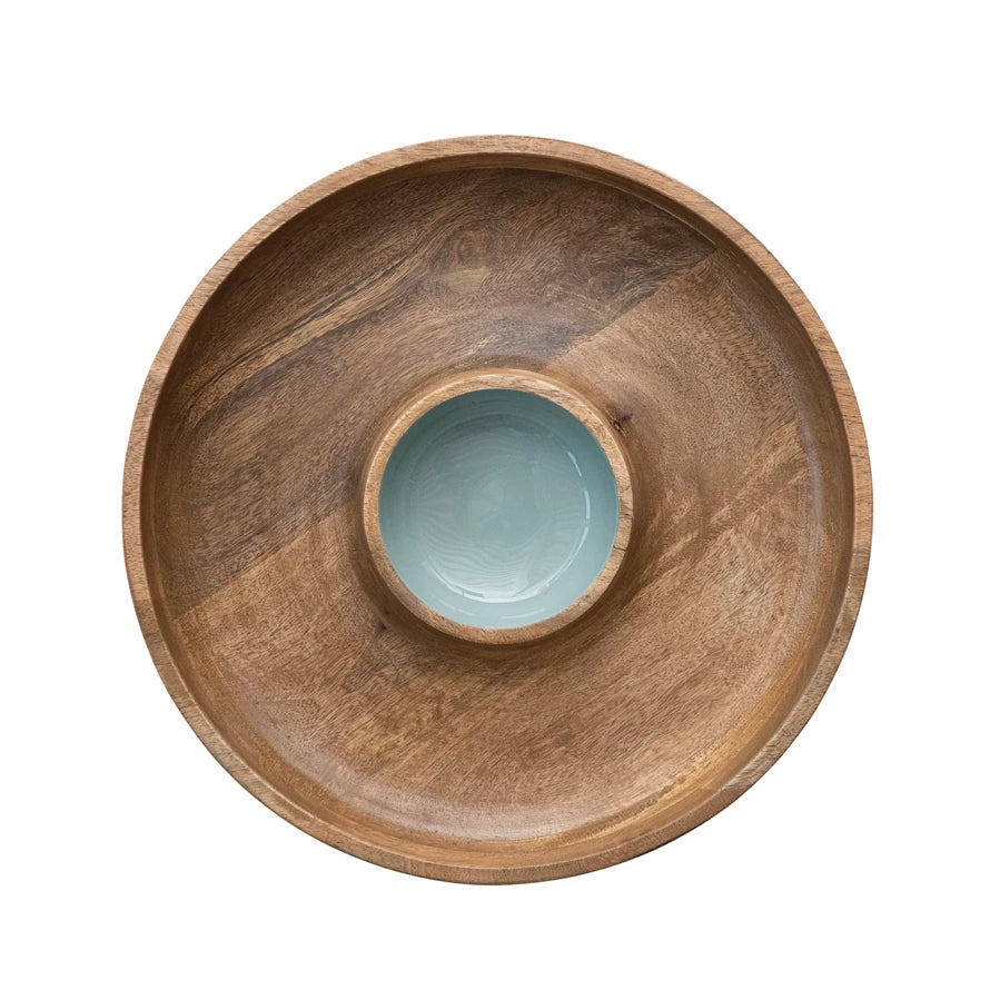 Serve up style and convenience with our Mango Wood Lazy Susan Server. Crafted from beautiful mango wood, this 13-3/4" round server features 2 sections and an enameled center in a natural and blue color palette. Perfect for entertaining, this practical piece adds a touch of fun to any table.
