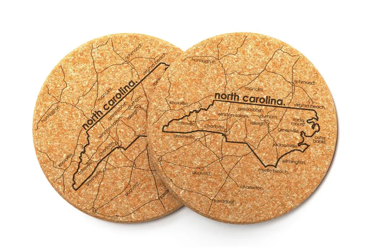 Show your NC pride with this cork coasters etched with the iconic borders, roads, and cities of the great state of North Carolina. The lightweight and absorbent cork material protect your tabletop while the engraved state design serves as a great conversation starter. Each set of 2 coasters comes packaged in a stylish muslin bag.