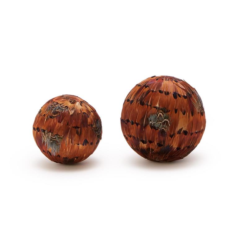 Add a touch of autumn charm with this playful pheasant feather decorative ball. Covered in feathers with rich brown tones, it brings warmth and texture to any space. Perfect for mixing with boxwood balls in a bowl, it creates a fun and inviting fall display. Available in two sizes to suit your style and space. Very lightweight!