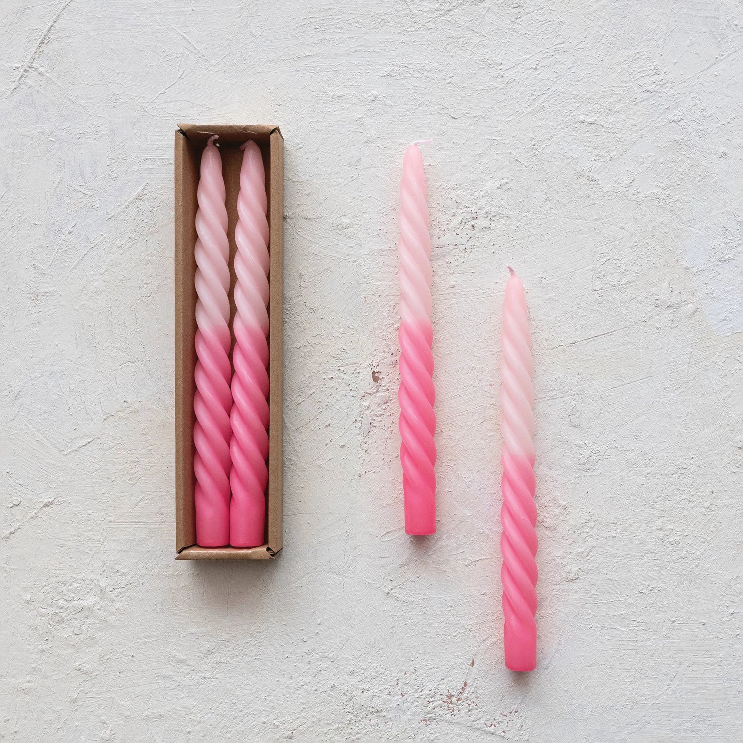 Spice up your space with our Twisted Ombre Taper Candle Pair! These 1" round x 10"H unscented candles feature a unique ombre design that adds a touch of whimsy to any room. With a burn time of approximately 6-1/2 hours, these candles are both stylish and long-lasting.