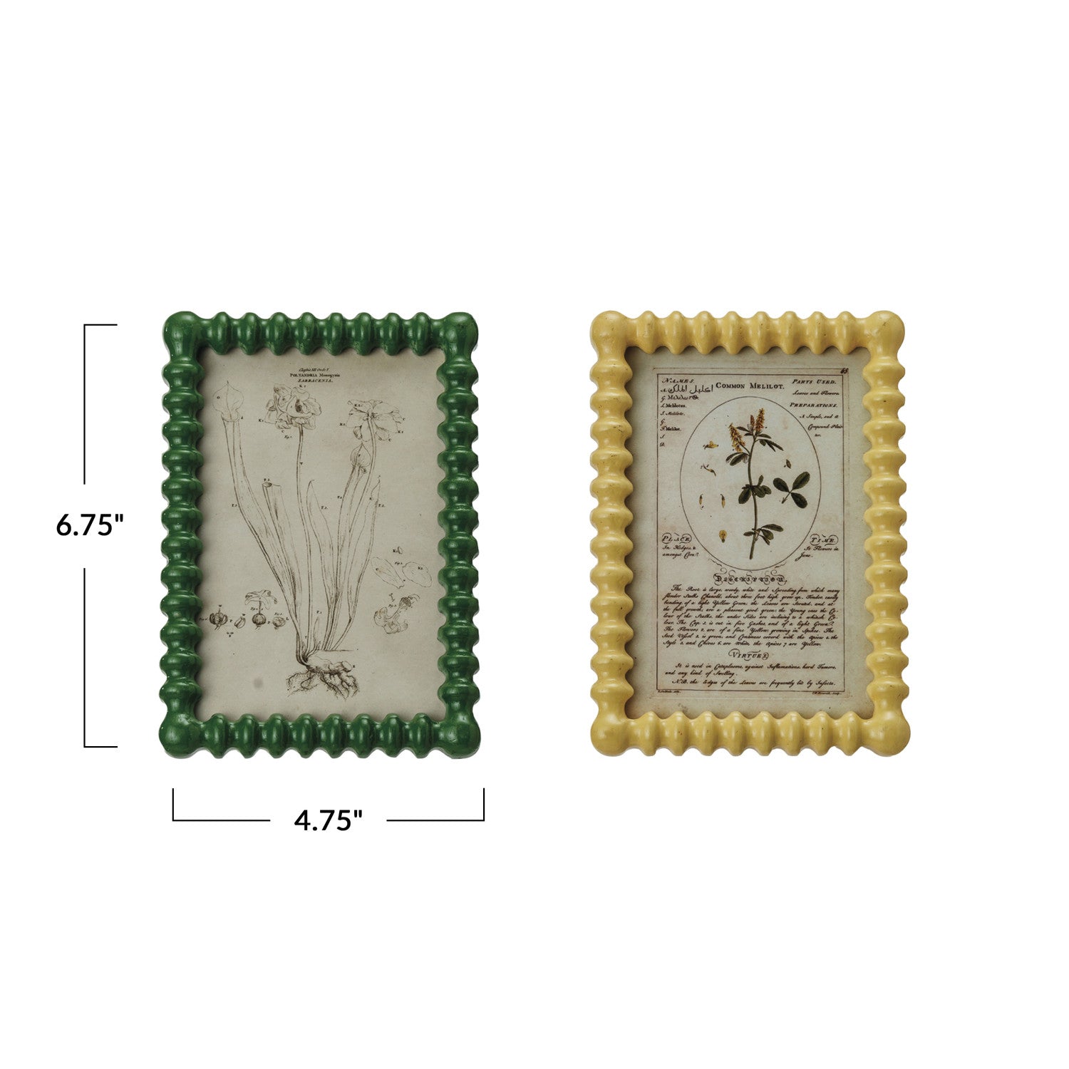 Add a splash of charm to your space with this playful Wood Spindle Photo Frame! Measuring 4-3/4" wide by 6-3/4" high, it showcases your favorite 4" x 6" memories alongside a delightful vintage reproduction image. Choose from sunny yellow or fresh green to brighten up your room with a pop of color and timeless style. Perfect for adding personality and a touch of whimsy to any tabletop or shelf!